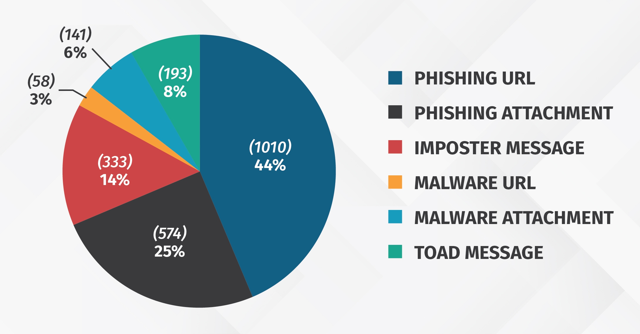 - 8% are Telephone Oriented Attack Delivery (TOAD) attacks. This is a new category that Proofpoint added in 2023 due to the increase of these type of phishing attacks. The goal is to get the victim to call a phone number.