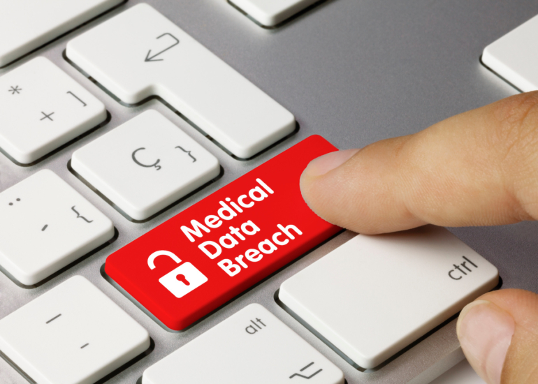 A red Medical Data Breach button on a laptop keyboard.