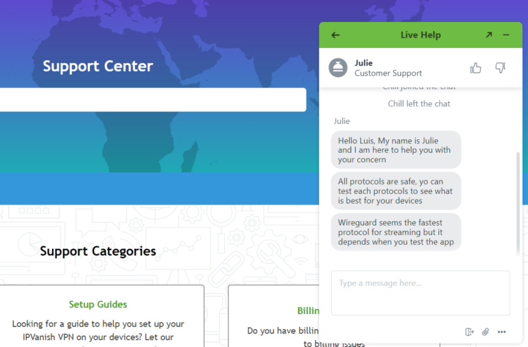 During my testing of IPVanish, I tried out their live-chat to see if their 24/7 claim holds up. I sent a support message asking which protocol was best for security and which was best for streaming. I was impressed as I was immediately connected with an agent in under one minute and received helpful answers that didn’t feel templated or too robotic.