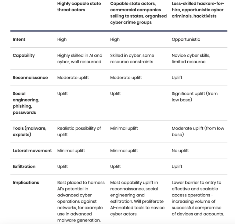 The report sorted threats (Figure A) by potential for “uplift” from generative AI and by the types of threat actors: nation-state sponsored, well-organized and less-skilled or opportunistic attackers.