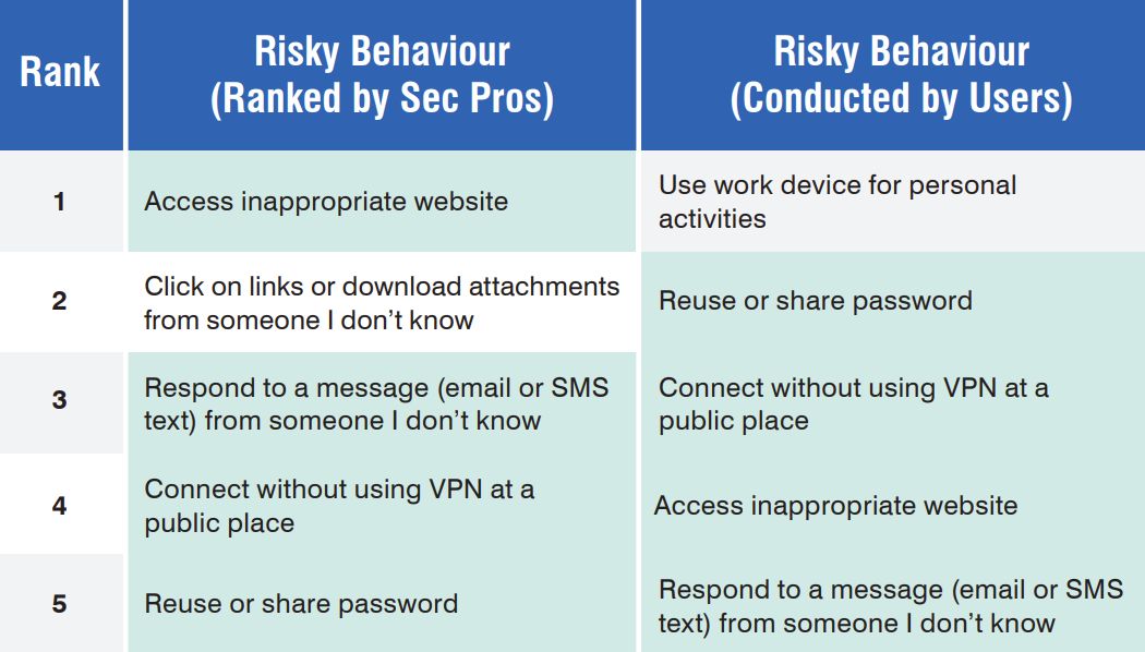 Employees were also actively reusing or sharing passwords, connecting their work device without using a VPN in a public place, and responding to email and SMS messages from someone they didn’t know.