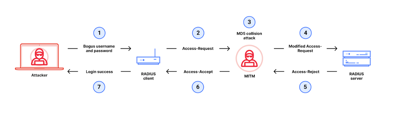 Exploiting the vulnerability leverages a man-in-the-middle attack on the RADIUS authentication process. It hinges on the fact that, in the RADIUS protocol, some Access-Request packets are not authenticated and lack integrity checks.