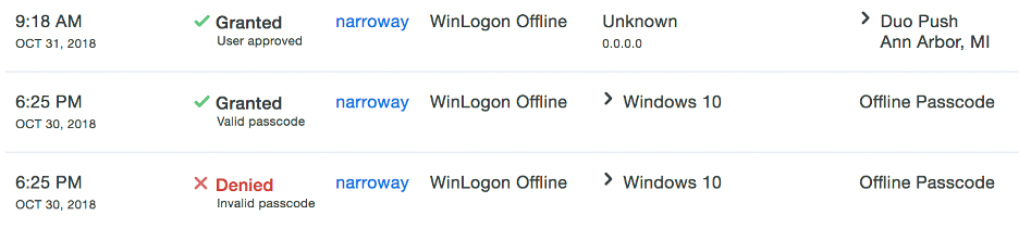 Once you activate offline access for your account, users can automatically login with either an offline security code (provided through the Duo mobile app) or a security key, even when your phone cannot accept a traditional push request. Admins also have full visibility into these authentications and can see when users are utilizing offline authentication, the devices that are accessing resources, and if those authentications were successful.