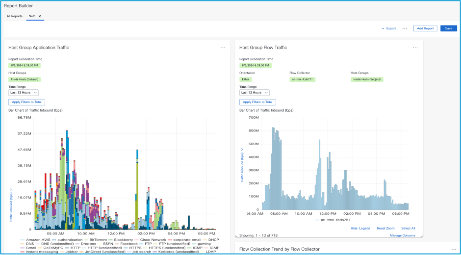 Other Custom Dashboards can be created to combine multiple data sets into one page and customize the widgets on a page based on your need. This allows analysts to visualize multiple data types on a single page to easily correlate and to view the complete workflow: from a bird’s eye view to single flows, pivot to deep dive based on current context, filter and sort on any data type (ex. filter by host group, flow collector, application)