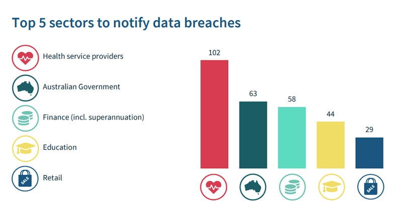 - The top five sectors suffering data breaches were health service providers (102 breaches), the Australian Government (63), finance (58), education (44), and retail (29).